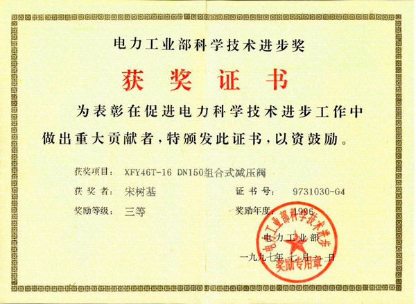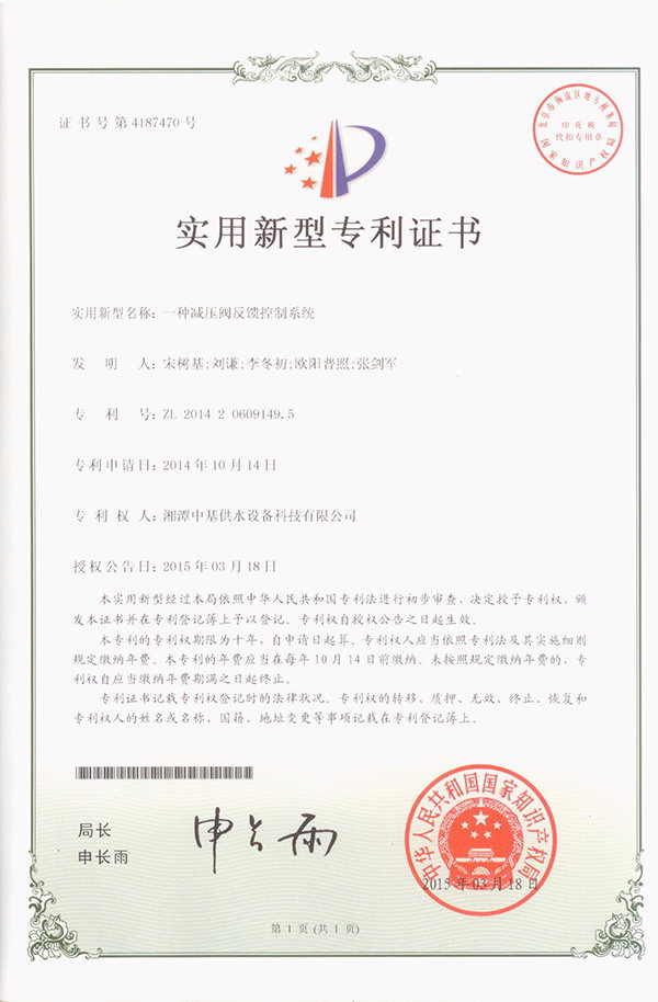 • 一種減壓閥反饋控制系統專利證書