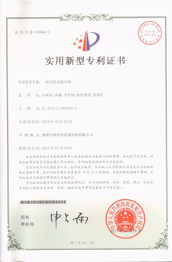 • 一種活塞式減壓閥專利證書