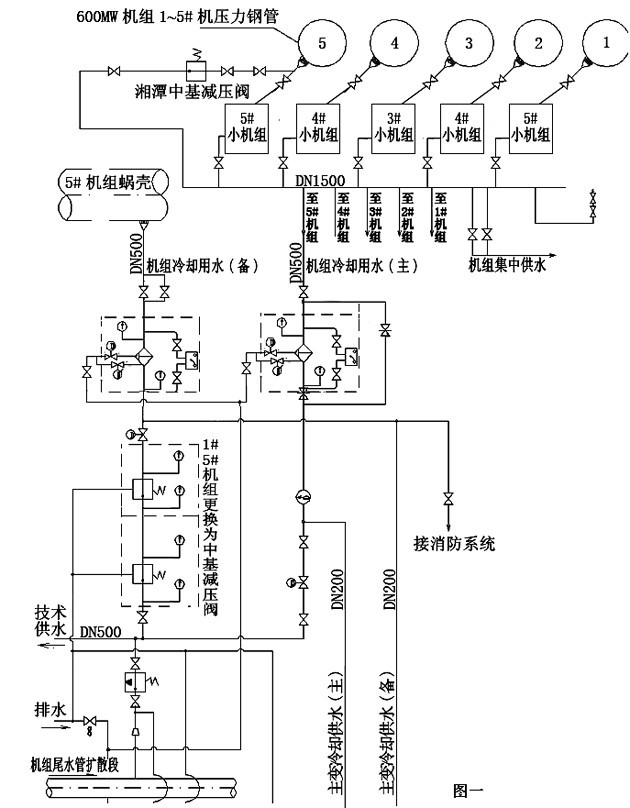 3.1機(jī)組技術(shù)供水系統(tǒng)(如下圖一所示)設(shè)計采用技術(shù)供水水源機(jī)組(小機(jī))集中供水和單機(jī)單元自流減壓供水的混合供水方式,其中一路是采用5臺水源機(jī)組發(fā)電減壓后的尾水集中匯流至匯流母管,從匯流母管上分別引出5路供水作為600MW機(jī)組的技術(shù)供水主用水源,另一路采用600MW機(jī)組鋼管取水通過自流減壓后作為600MW機(jī)組的技術(shù)供水備用水源。