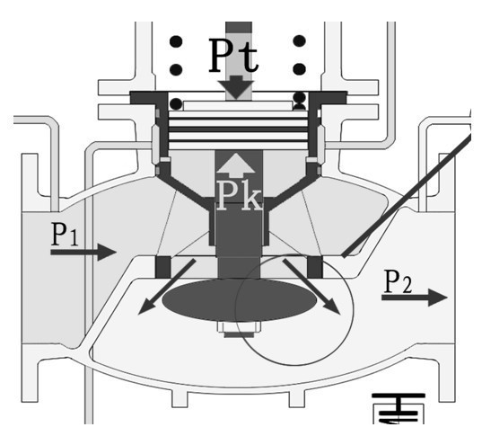當(dāng)P1上升時,減壓閥的P2+ΔP2首先表現(xiàn)為上升,其值通過反饋系統(tǒng)出口管傳到控制閥,使Pt′+ΔPt′,ΔPt′與Pk′的力達(dá)到新的平衡,控制閥h減??;相應(yīng)ΔPk′壓力增大,經(jīng)壓力導(dǎo)管,使主閥的Pk+ΔPk,Pt=Pk+ΔPk壓力達(dá)到新的平衡,主閥h減小、ΔP2值恢復(fù)為原P2值。當(dāng)進(jìn)口壓力P1下降時,主閥與控制閥的工況則與上述的工況相反。